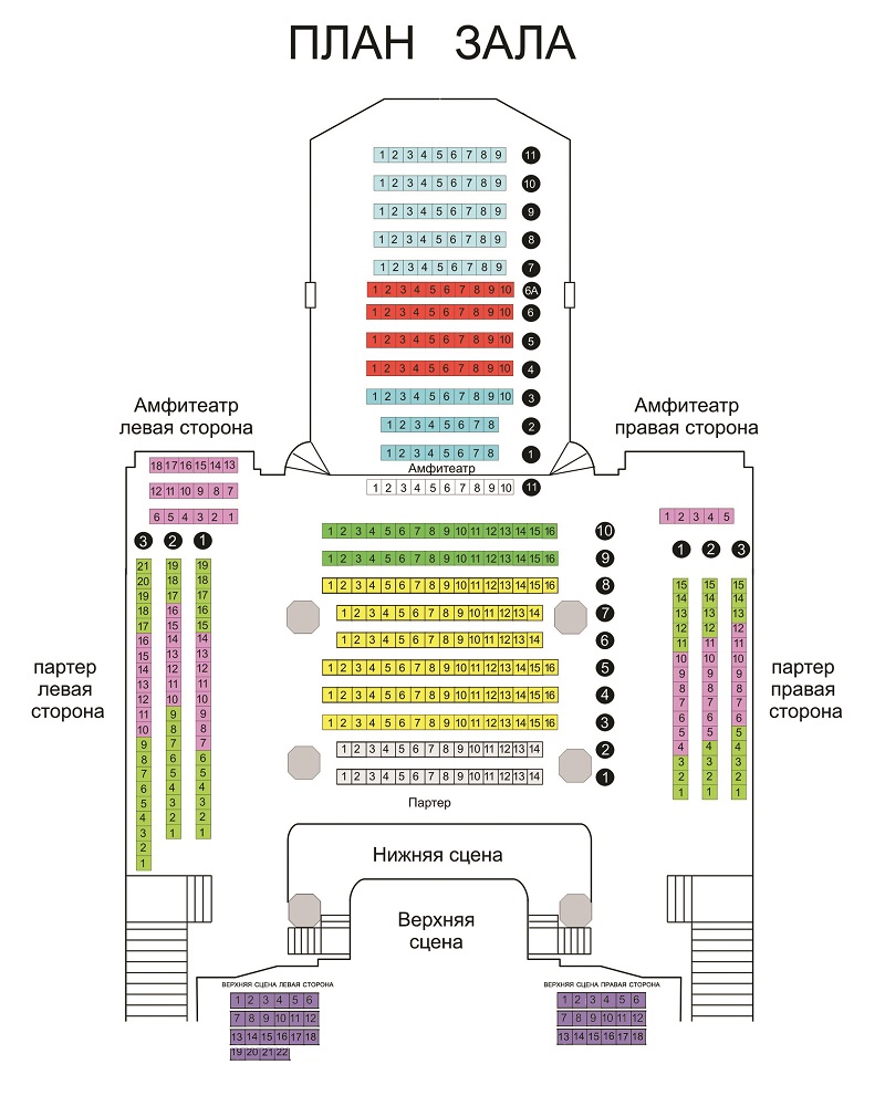 Актуальная схема концертного зала Калининградской областной филармонии имени Е.Ф. Светланова. Здесь можно заранее сориентироваться по расположению мест и уровней зала перед покупкой билетов.